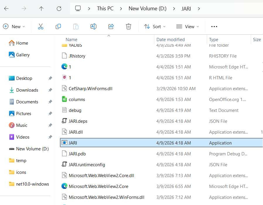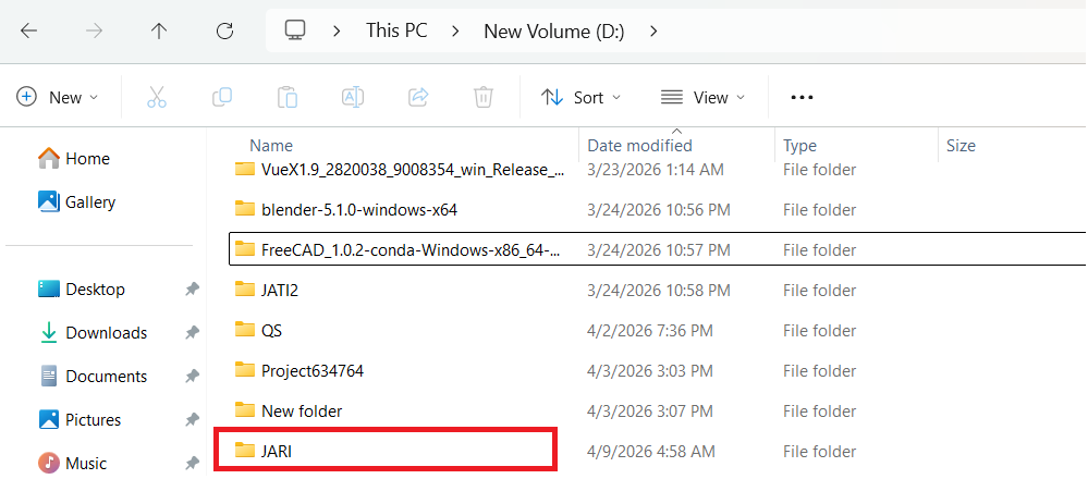 2. Extracted the files in D:/ drive. It is preferred to extract in D:/ drive or E:/ drive other than C:/ drive due to windows security. Start JARI.exe