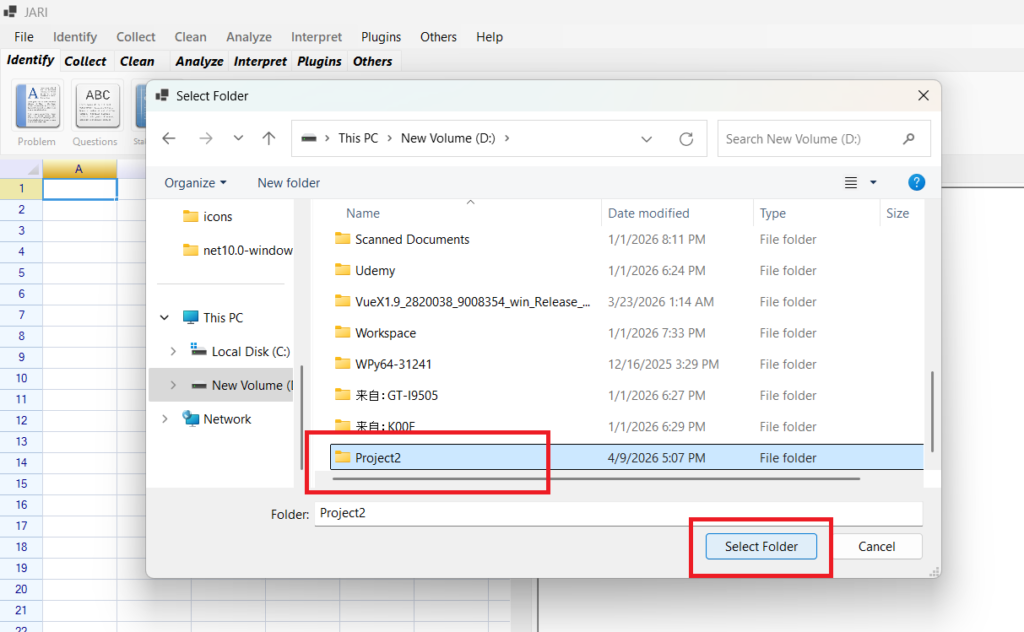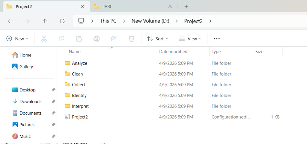 In project folder, you should see Identify folder, Collect Folder, Clean Folder, Analyze Folder, and Interpret Folder. JARI follows the Data Analysis Process. You should be spending time in these folders for the project.