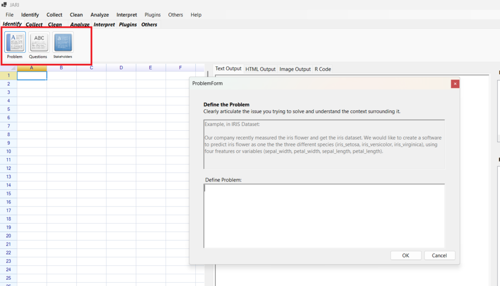 Click on Problem, or Questions or Stakeholders to write your Problems, SMART Questions and Stakeholders for your Data Analysis projects.