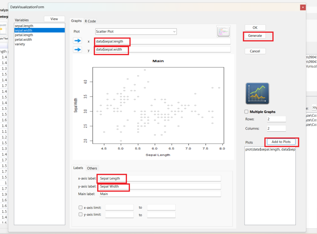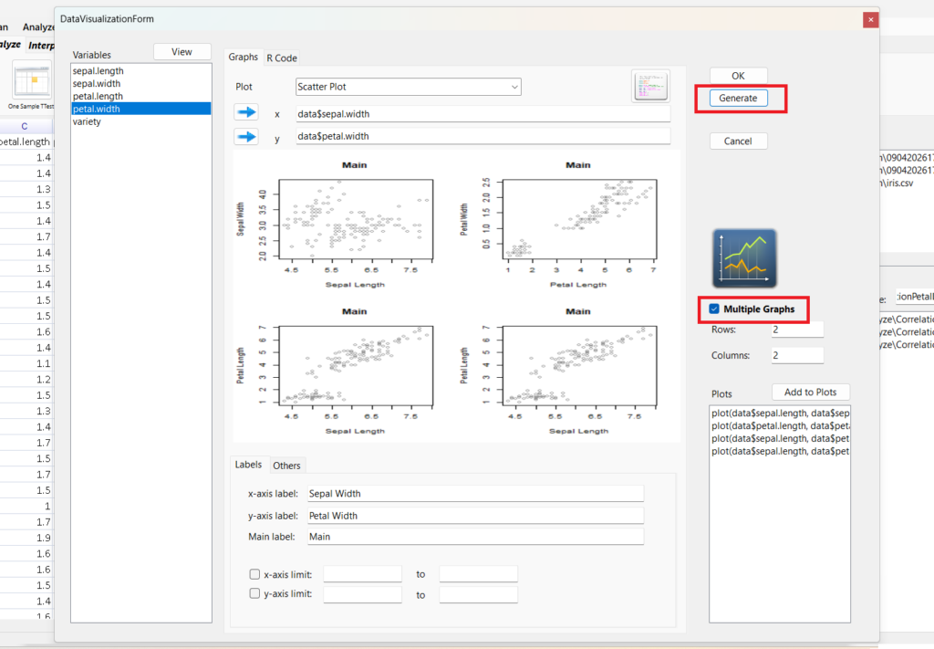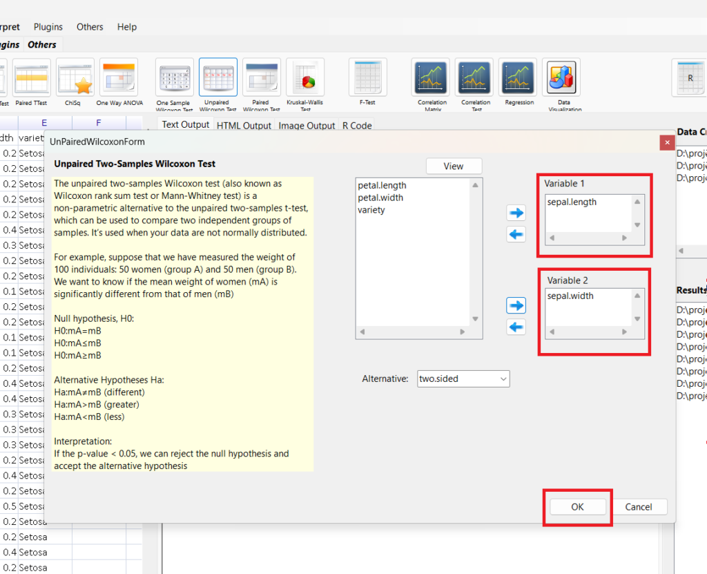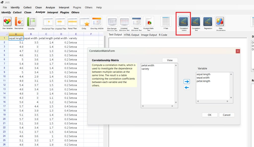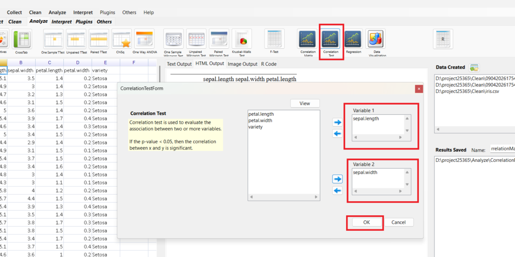 Click Correlation Test. Select Sepal Length and Sepal Width. Click Ok.