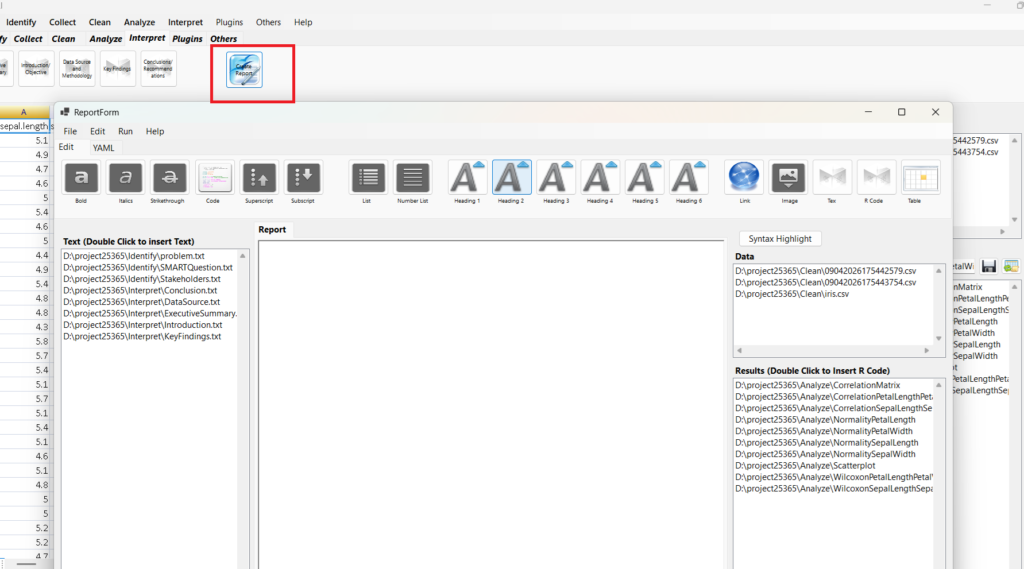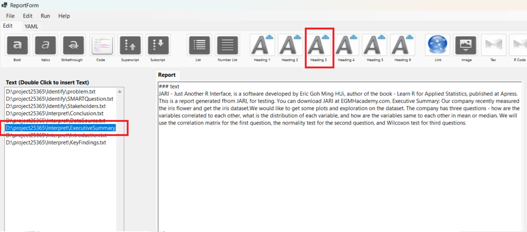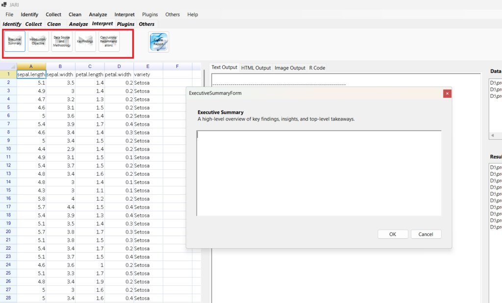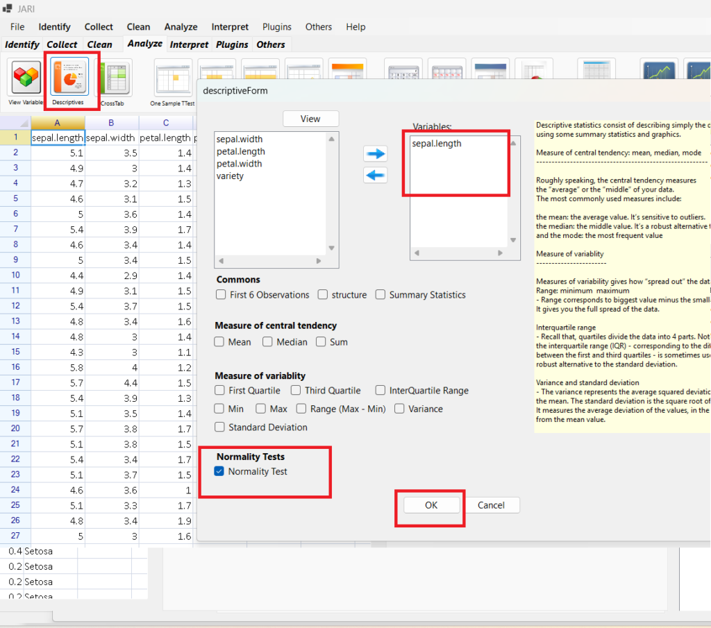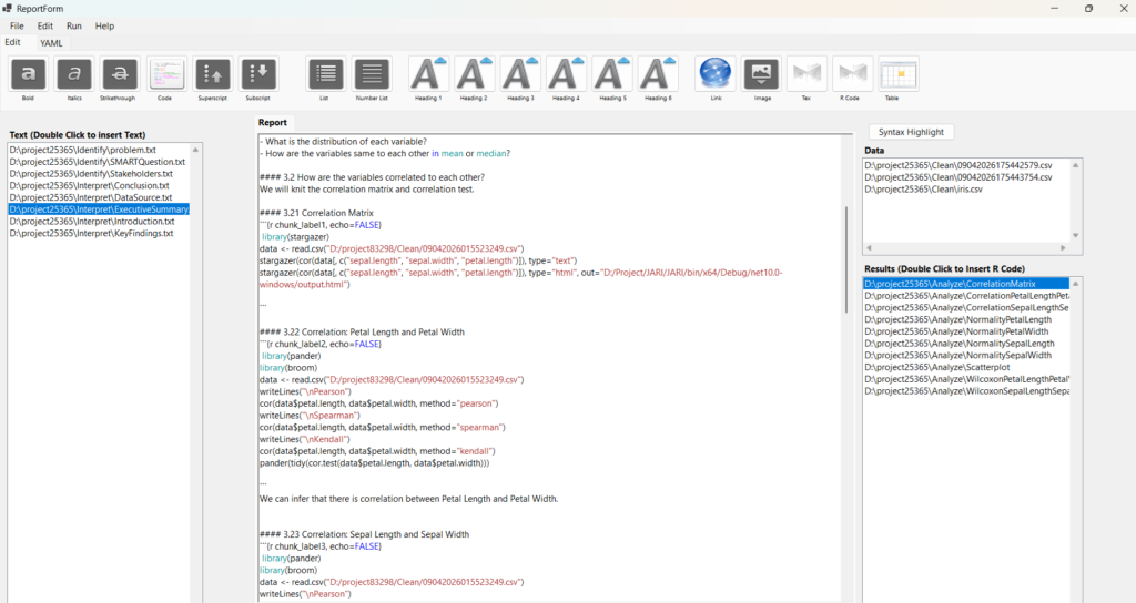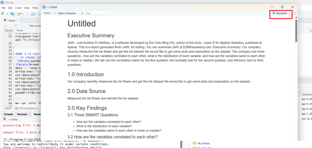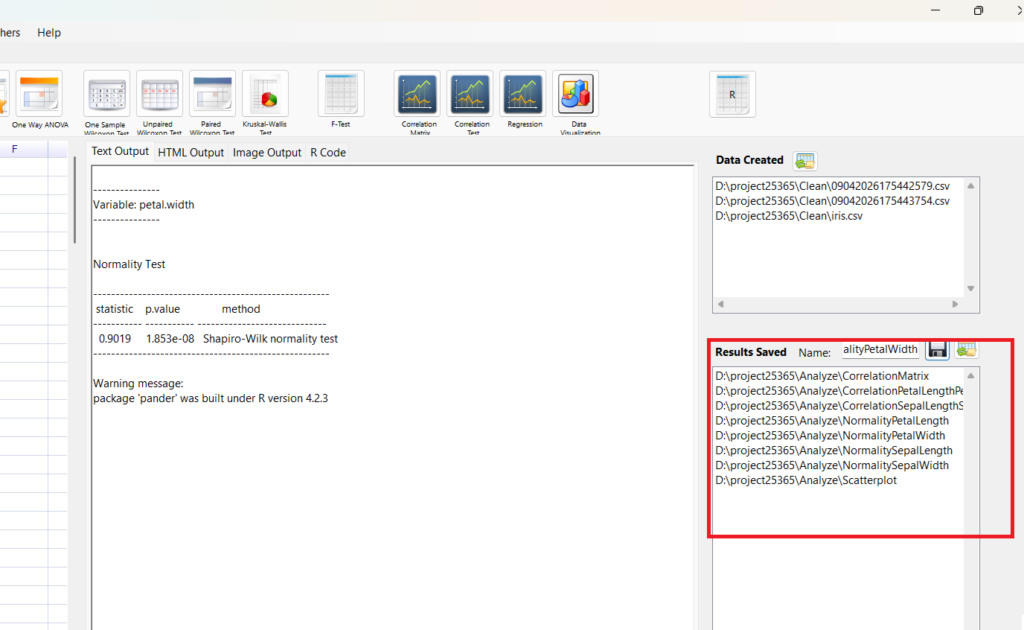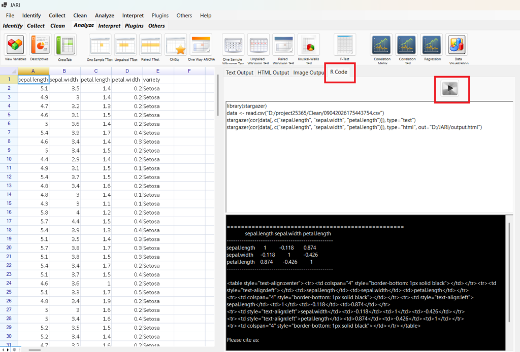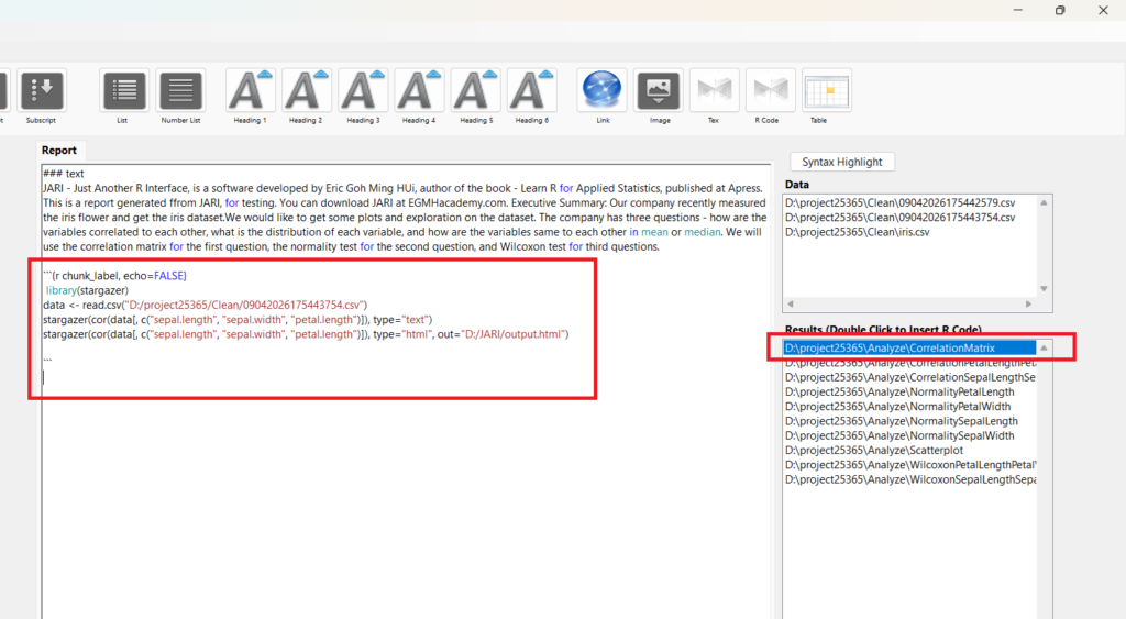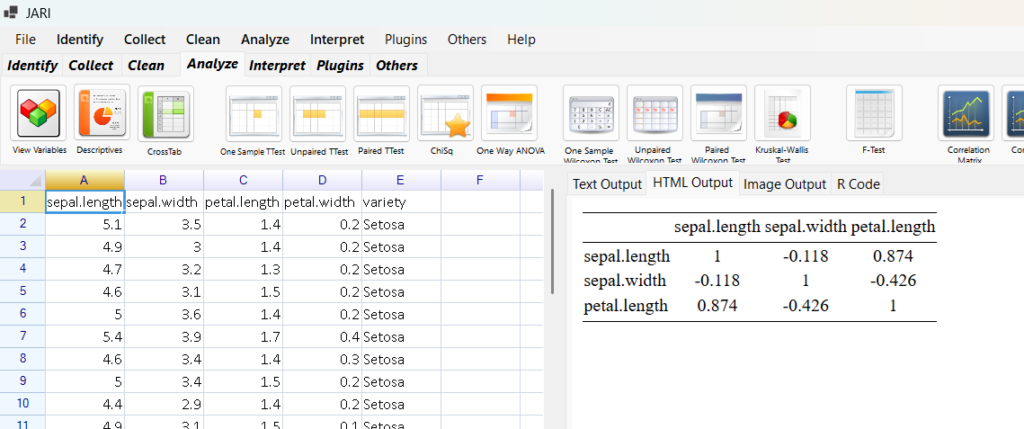 JARI – Just Another R Interface, is a software developed by Eric Goh Ming HUi, author of the book – Learn R for Applied Statistics, published at Apress. This is a report generated ffrom JARI, for testing. You can download JARI at EGMHacademy.com. Executive Summary: Our company recently measured the iris flower and get the iris dataset.We would like to get some plots and exploration on the dataset. The company has three questions – how are the variables correlated to each other, what is the distribution of each variable, and how are the variables same to each other in mean or median. We will use the correlation matrix for the first question, the normality test for the second question, and Wilcoxon test for third questions.