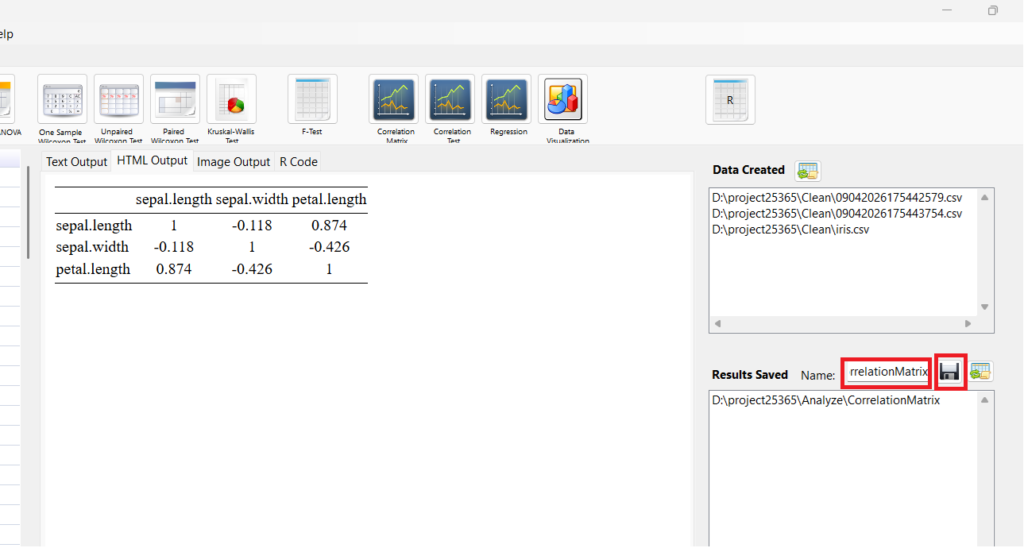 At the right side, there is Results Saved. Name CorrelationMatrix (no spacing) and click save. We save the results.