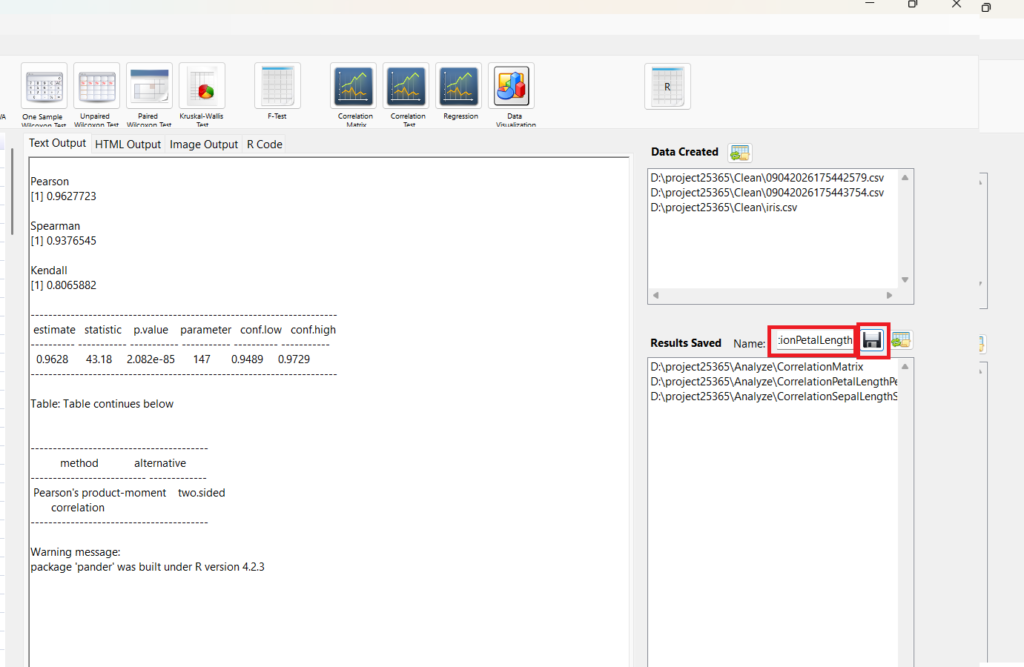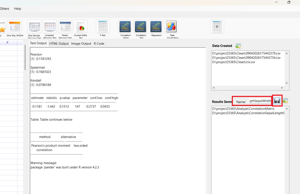 Save results. Name CorrelationSepalLengthSepalWidth.